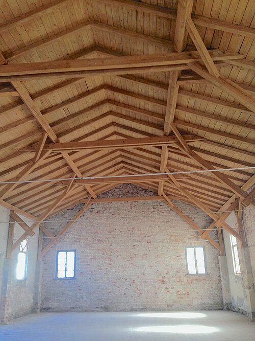 Das Gebäude wurde vollständig entkernt und von nachträglichen Einbauten befreit. Aus Altunterlagen ersichtliche Fenster und die Große Toröffnung nach Osten wurden wiederhergestellt und mit neuen Holzfenstern versehen. Die historische Dachkonstruktion konnte freigelegt und sichtbar belassen werden, eine außenliegende Dachdämmung sorgt für zeitgemäßen Wärmeschutz, wie auch die innenseitige Dämmung der Außenwände. Der Rückseitige neue Sanitäranbau wird durch eine Pergola ergänzt, hier sind Sitzplätze der Außengastronomie angeordnet.