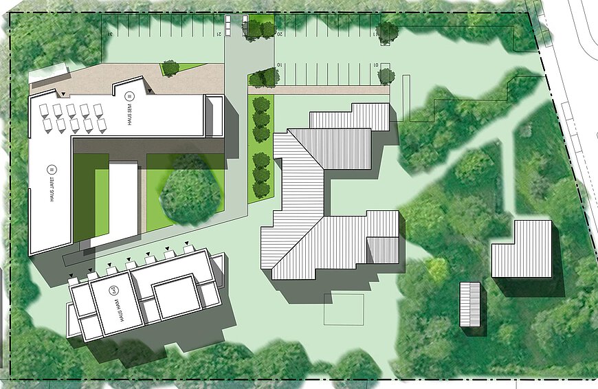 „Sehr positiv wurde die städtebauliche Anordnung des Gebäudeensembles bewertet. Die Verdrehung des westlichen Baukörpers bindet das Gemeindezentrum sinnvoll ein und generiert einen spannenden Raum. Der Hof ist differenziert gestaltet und schafft hohe Aufenthaltsqualität mit vielfältigen Nutzungsmöglichkeiten. (...)