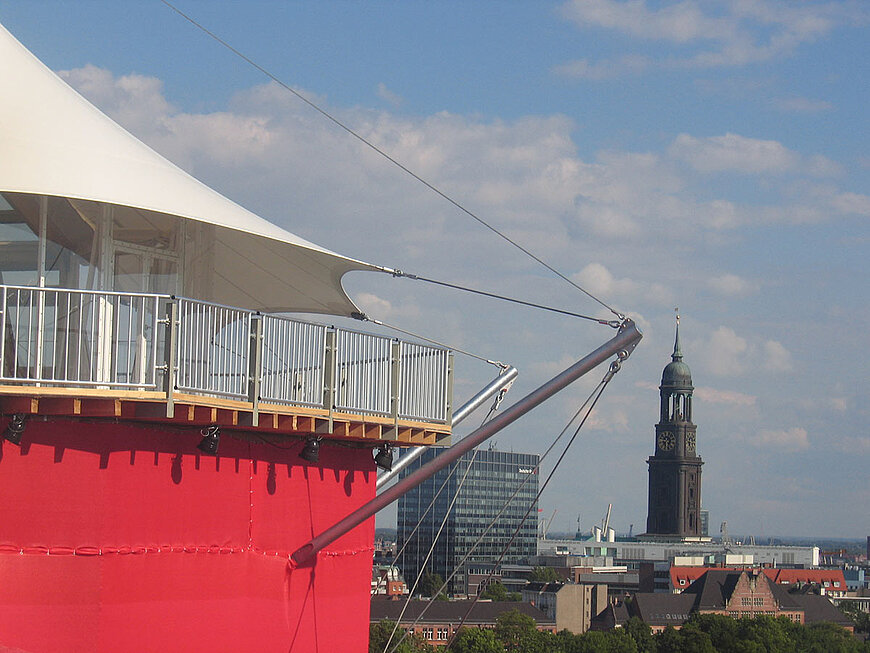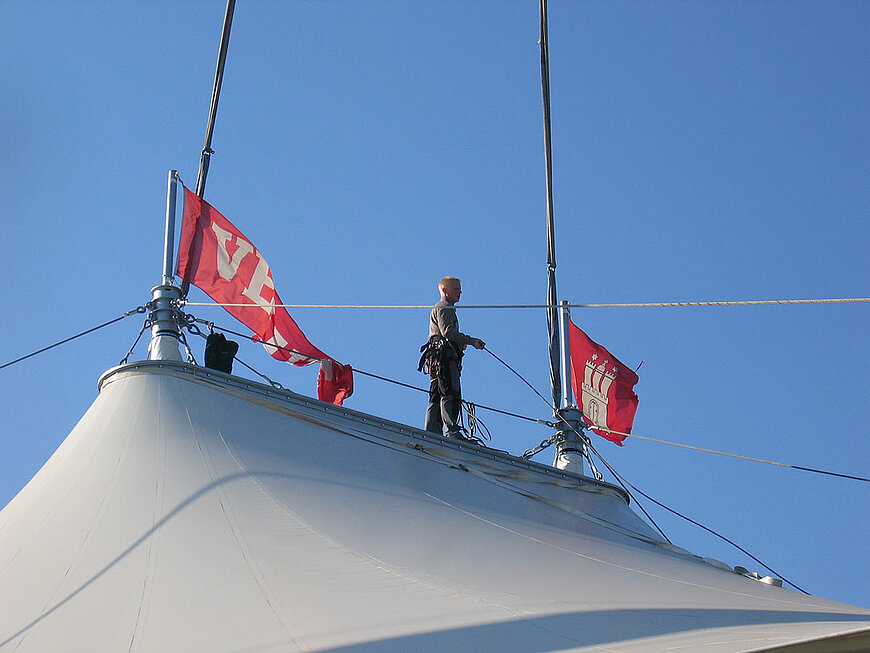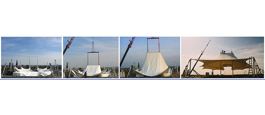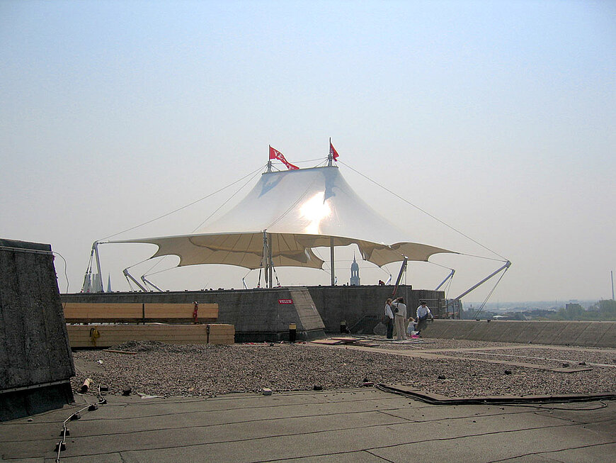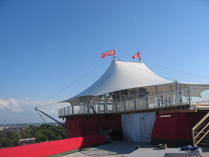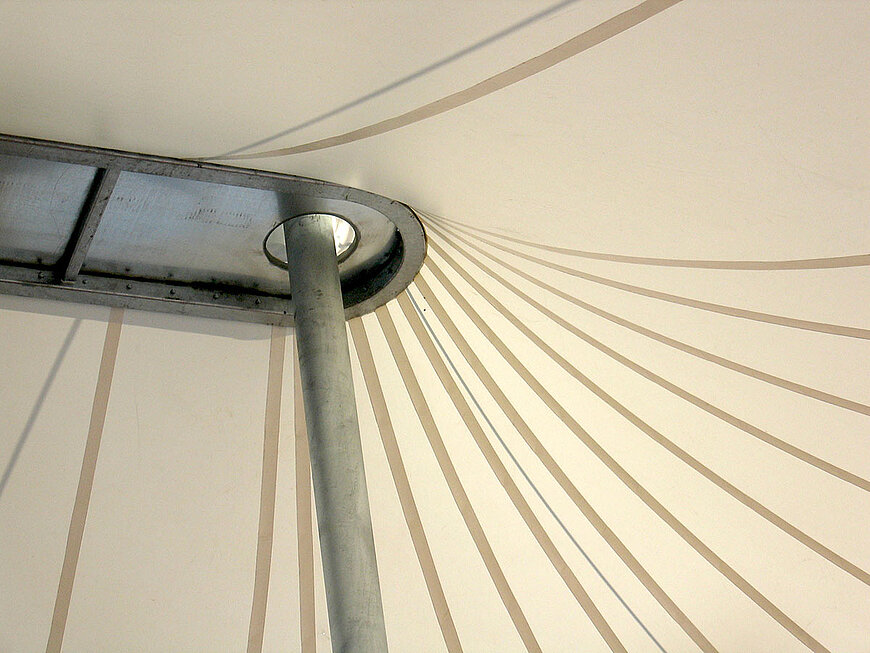 Die 378 Quadratmeter große Zeltmembran wurde von zwei gelenkig gelagerten Zentralmasten gehalten. Die Masten, mit einer Belastbarkeit von jeweils 30 Tonnen, erhielten über Zugseile und Druckstäbe ihre Stabilität und Spannung – ebenso das Textildach.