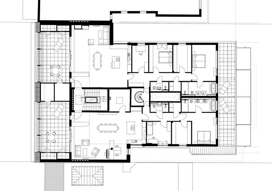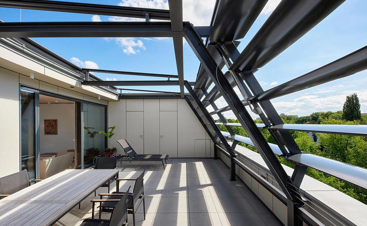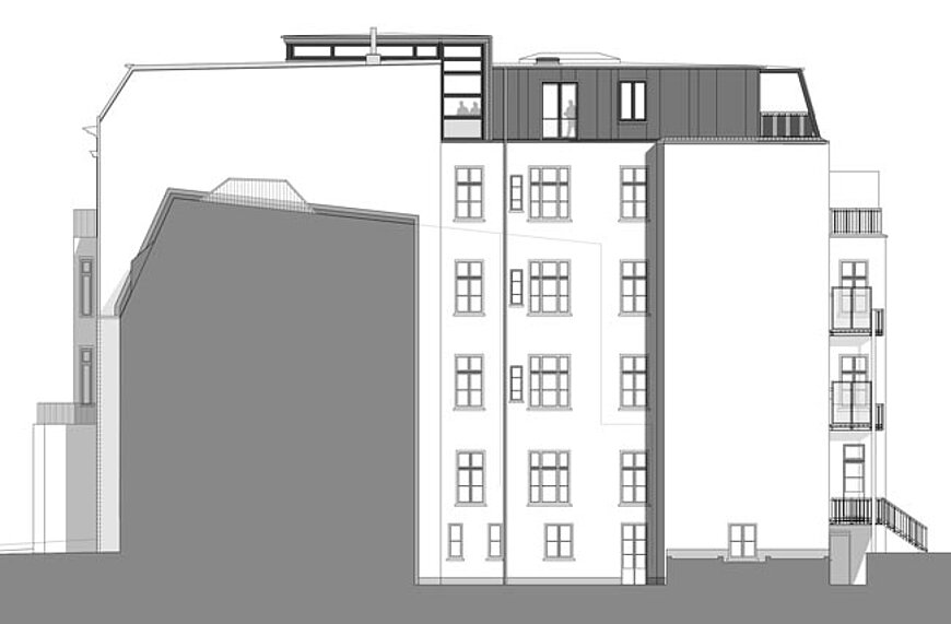 Aufgrund der engen Bauweise des Gebäudes mit den typischen Schlitzhöfen, welche nach heutiger Bauordnung nicht mehr zulässig sind, mussten für die neuen Dachgeschosswohnungen hohe Brandschutzauflagen erfüllt werden. Als besondere Herausforderung stellten sich die Küchenfenster heraus, vor diesen mussten Brandschutzvorhänge installiert werden, welche im Brandfall einen Brandüberschlag auf Nachbargebäude verhindern sollen.