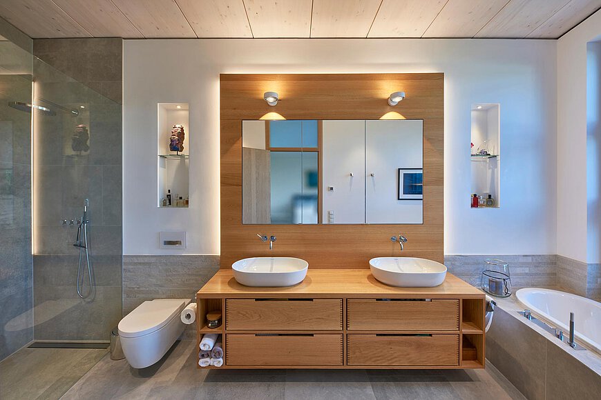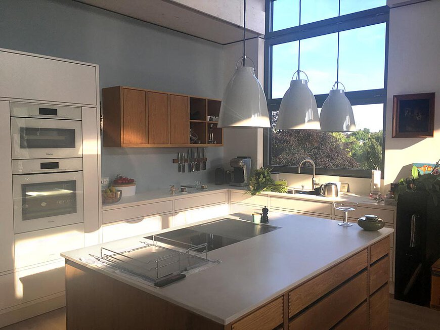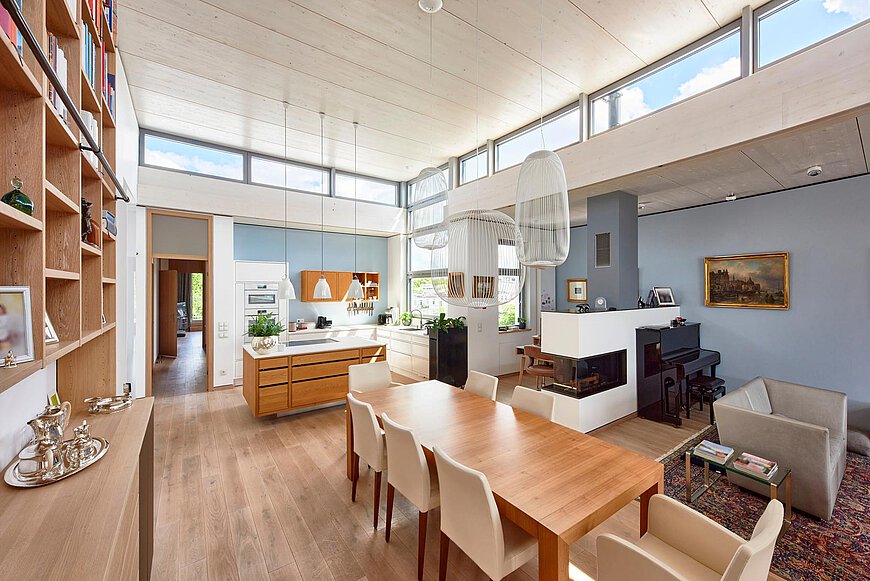 Einbau-Möbelstücke, Küche, Kamin, Türen und Beleuchtungskonzept sind harmonisch miteinander als Gesamtgestaltung miteinander entwürfen und abgestimmt.