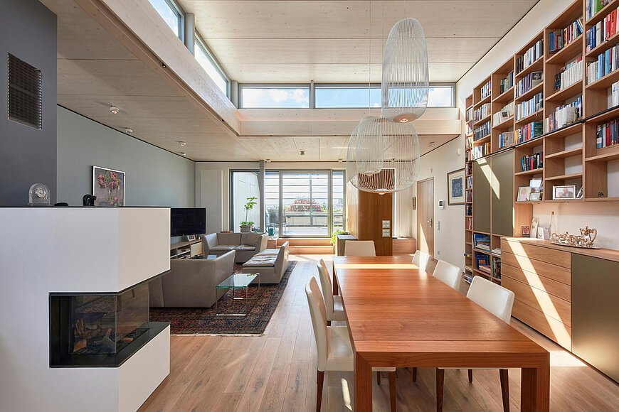 Das Dachgeschoss wurde in Holzbauweise errichtet, die Wände in Holzständerbauweise und die Dachelemente aus Brettstapelelementen.