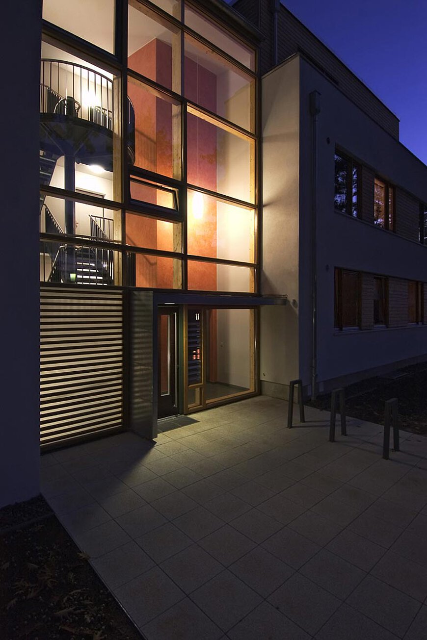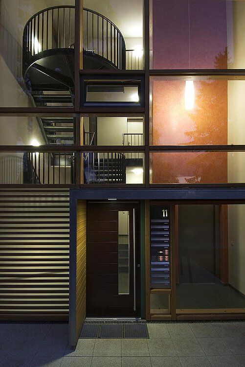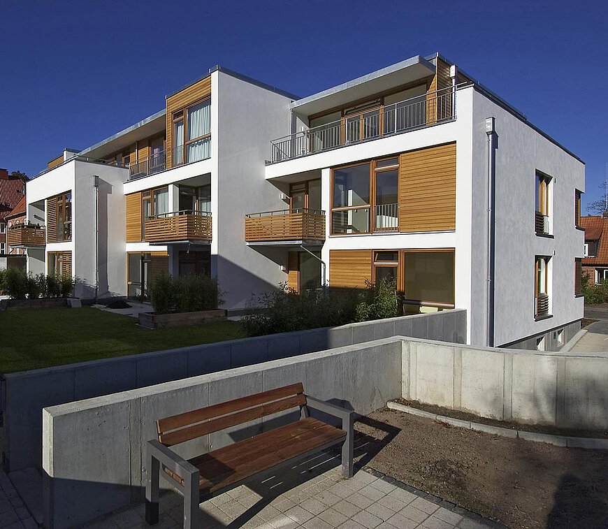 Im zweigeschossigen Vorderhaus mit zurückgesetztem Dachgeschoss entstanden zehn komfortable Mietwohnungen unterschiedlicher Größe. Von der rollstuhlgerechten 2-Zimmerwohnung mit ca. 80 Quadratmetern bis zur 4- Zimmer-Maisonettewohnung mit ca. 150 m2 stehen verschiedenste Grundrisse zur Auswahl. Schwellenfreie Wohnungen (insgesamt 8 von 10), geräumige Grundrisse und bodengleiche Duschen sowie ein Aufzug mit direkter Anbindung an die Tiefgarage dienen der Unterstützung der Mobilität. Großzügige Terrassen und Balkone sind nach Süden zum geschützten Gartenhof ausgerichtet.