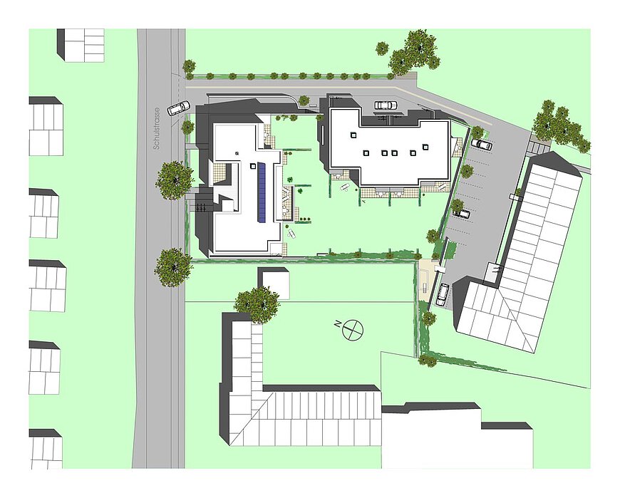 Außerdem entstanden auf dem Grundstück Schulstraße vier Reihenhäuser mit 4 - 5-1/2 Zimmern und 130 - 138 m2 Wohnfläche. Der Zugang erfolgt über einen ruhigen Privatweg. Jedes Reihenhaus besitzt vorne einen abgetrennten gepflasterten Privatbereich. Die zweigeschossigen Reihenhäuser sind voll unterkellert und verfügen über einen direkten Zugang zur Tiefgarage.