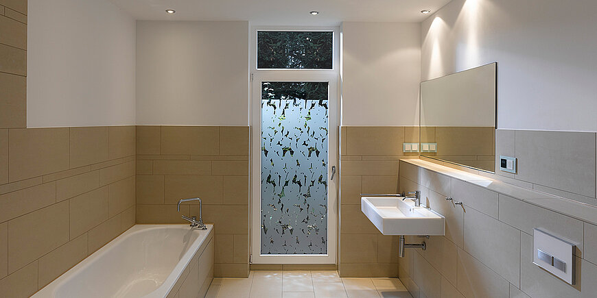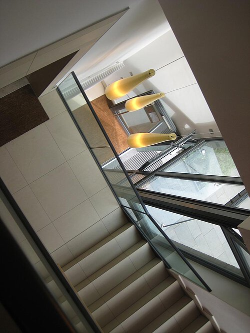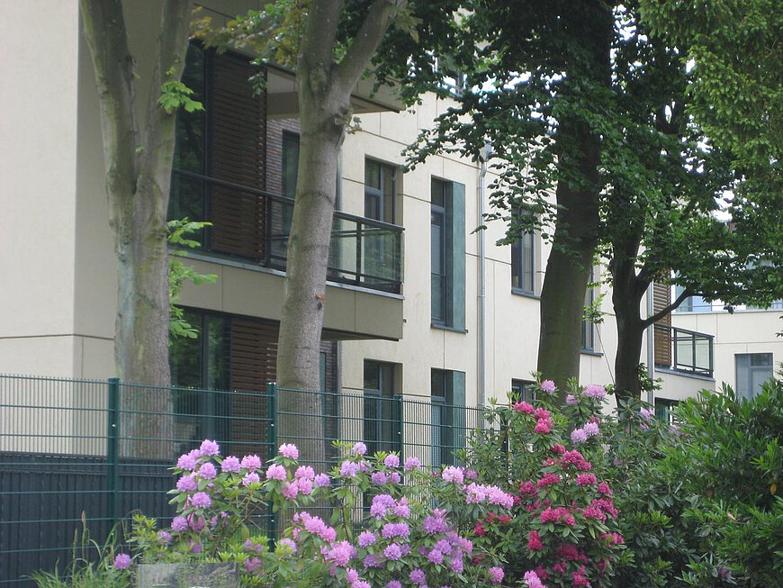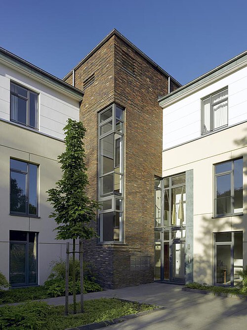 Eine zentraler Treppenturm steht als Verbindungsglied und signalisiert den Eingang. Die großzügige Fenstergestaltung mit Eckverglasungen erzeugt einen räumlichen Übergang zu den großzügigen Terrassen und Balkonen und drückt eine moderne Einstellung zum Raumgefühl aus. Alle Wohnungen sind barrierefrei erreichbar und verfügen mit bodengleichen Duschen, Parkett- und großformatigen Feinsteinzeugbelägen sowie hochwertigen Ausstattungen und Armaturen über einen der Lage angemessenen Standard.