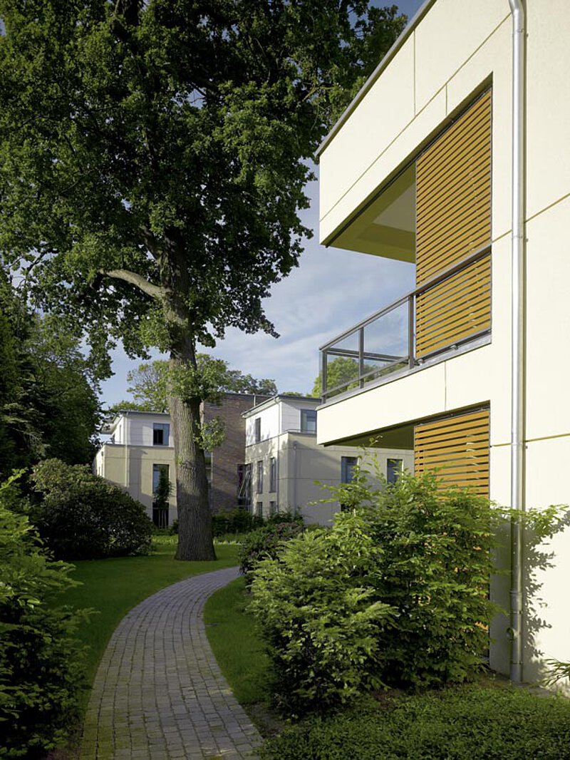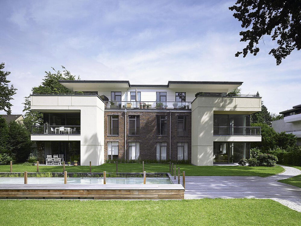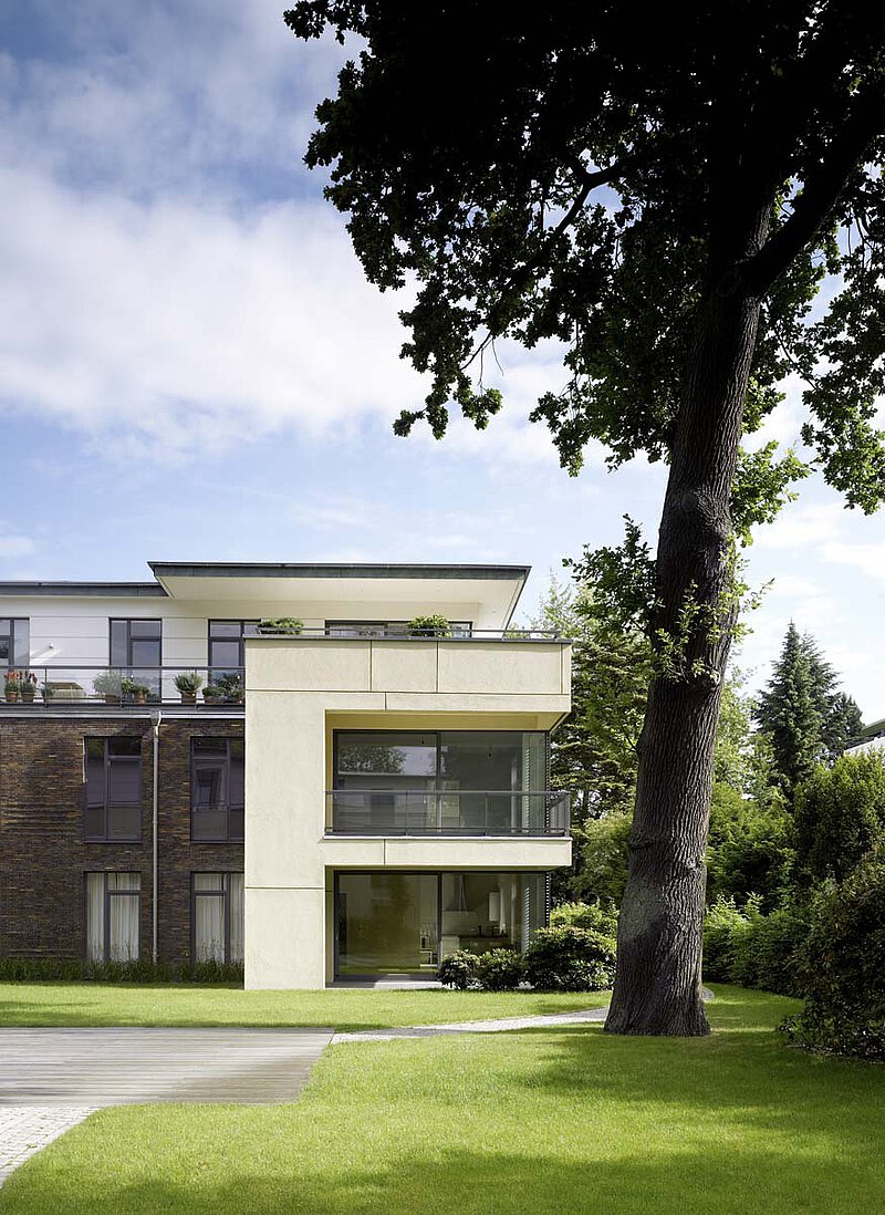 Gutachterlicher Wettbewerb 2009, ausgewählte Arbeit. Diese zwei Villen, in eine passende parkartige Außenanlage gesetzt, vervollständigen das städtebauliche Villen-Ensemble an der Elbchaussee in Hamburg und bilden ein kleines Idyll inmitten einer pulsierenden Großstadt. Passend zur städtebaulichen Umgebung, verweist die Architektur sowohl auf die traditionelle hanseatische Bauweise als auch auf eine internationale Modernität und bildet eine spannende Harmonie zwischen der zeitlosen Eleganz und dem modernen Zeitgeist. Durch Aufmerksamkeit für das Detail bei Auswahl und Entwurf der Ziegelverblender sind in Referenz zu den Backsteinfassaden der Schumacher-Zeit in Hamburg alle horizontalen Fugen zurückgesetzt, in ausgewählten Bereichen wurde ein Vorsprung jeder 3. Ziegelschicht ausgeführt. Die neue Interpretation einer Naturstein-Gestaltung in der Putzoberfläche erzeugt den Eindruck von übergroßen Steinquadern und unterstützt die kubistische Ausbildung der Gebäudeformen. Bei der Planung und Ausrichtung der 125 bis 200 m2 großen Wohnungen stand neben bestmöglicher Belichtung und Besonnung die Orientierung zur Elbe bei gleichzeitig größtmöglicher Privatheit im Vordergrund.