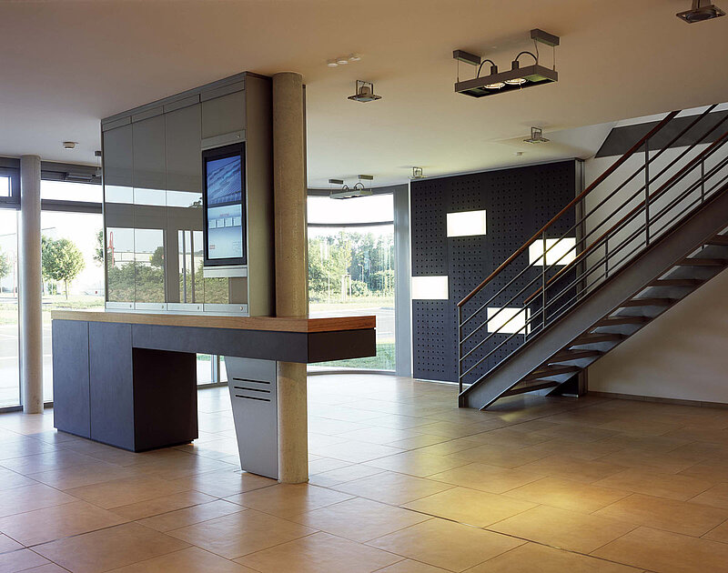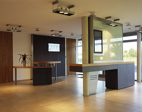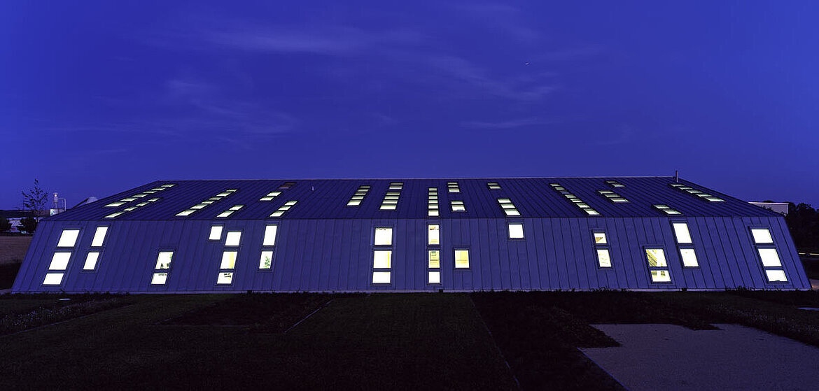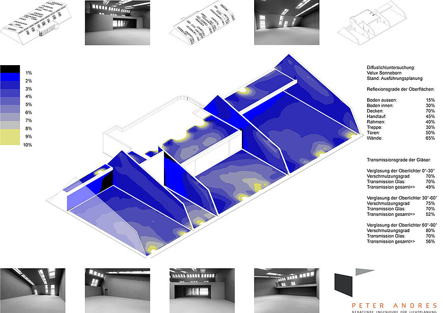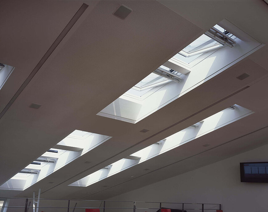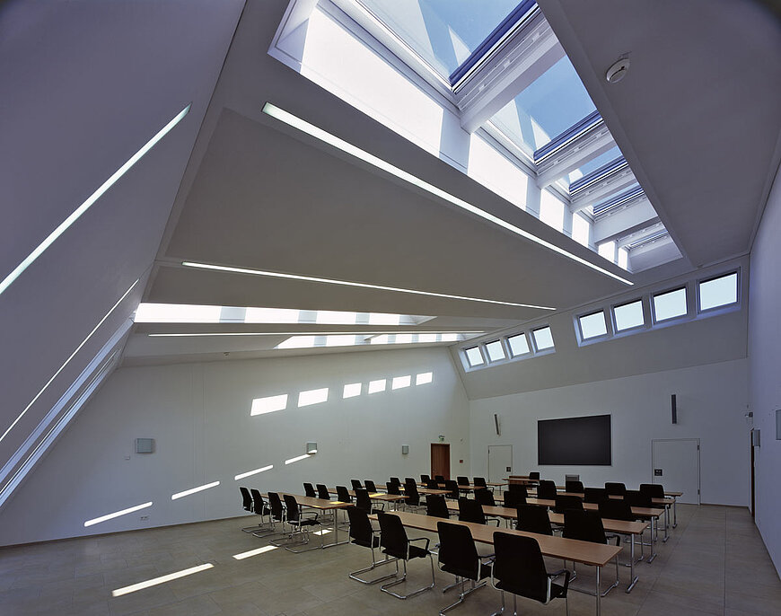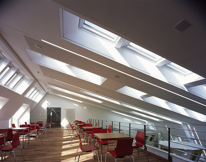 Unterschiedliche Sonnenstände zu den verschiedenen Jahres- und Tageszeiten führen durch die vornehmlich in Lichtstreifen angeordneten Dachflächenfenster zu immer neuen, abwechslungsreichen Lichtspielen im Raum. Der schräge Einfallswinkel der Sonnenstrahlen verhindert Blendungen oder störende Reflexionen. Stattdessen sorgt ein gleichmäßig diffuses natürliches Tageslicht für eine helle und freundliche Atmosphäre.
