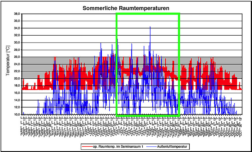 Mit umfangreichen Computersimulationen des Raumklimas wurde ermittelt, dass die vorgesehene Nachtkühlung die Innenraumtemperatur auch in den Sommermonaten auf angenehme 26 Grad Celsius begrenzt.