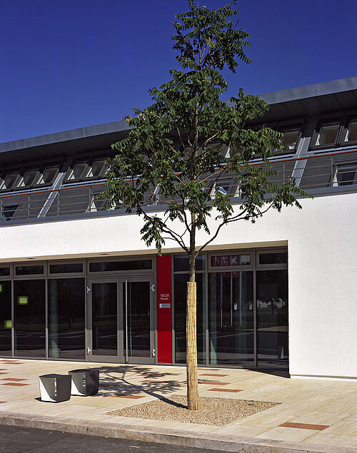 Die Außenanlagen nehmen die Streifenförmige Gestaltung der Fensterbänder in Form von Hecken und Pflanzstreifen auf. Als Bepflanzung wurden ortsübliche Bäume, Sträucher und Bodendecker verwendet. Durch den erforderlichen 1,5 m tiefen Bodenaustausch unter dem Gebäude verbleibender Bodenaushub wurde in Form eines Erdwalls in freier Form um das Grundstück genutzt. Ruheinseln für Kommunikation runden das Konzept im Außenbereich ab.
